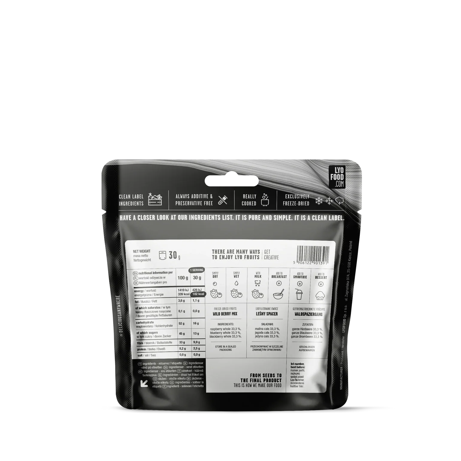 LYOFOOD Leśny Spacer zawiera wyłącznie liofilizowane owoce o prostym i przejrzystym składzie. Dzięki procesowi liofilizacji owoce zachowują intensywny smak, są lekkie i wygodne w transporcie, dlatego świetnie sprawdzają się na trekkingu, biwaku, w samochodzie, w pracy, w szkole albo jako szybka owocowa przekąska w domu. Produkt można jeść od razu po otwarciu opakowania lub dodać do mleka, śniadania, smoothie czy deseru.